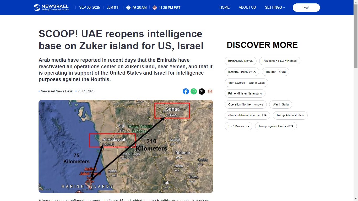جاء هذا في تسريب خطير للكيان الاسرائيلي، عبر وسائل إعلامه الرسمية، معلومات مصورة عن أن الامارات وعبر القوات اليمنية الموالية لها، "اعادت تشغيل غرفة عمليات استخباراتية في جزيرة زقر اليمنية، ضمن قاعدة عسكرية، تعمل لصالح الولايات المتحدة وإسرائيل لأغراض استخباراتية عسكرية ضد جماعة الحوثي".